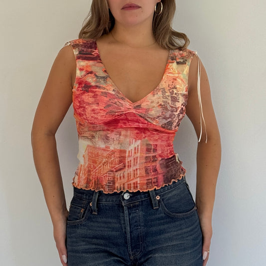 Orange graphic print mesh top - Size XS