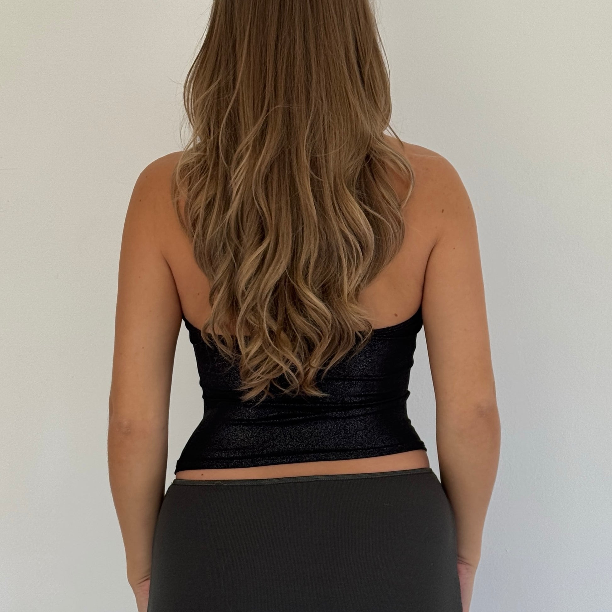 Morgan de Toi dark grey shimmery halter top, with a scoop neckline and diamanté cutout detailing.